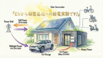 我が家のリサイクルと再生エネルギー 【一条・EVから秘密基地への給電実験です!】太陽光→深夜電力→EV大容量蓄電池→自立運転