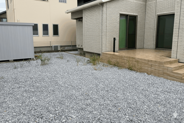 この砂利の下には、防草シートを全面張っていますが、たくましい雑草が生えてきます。