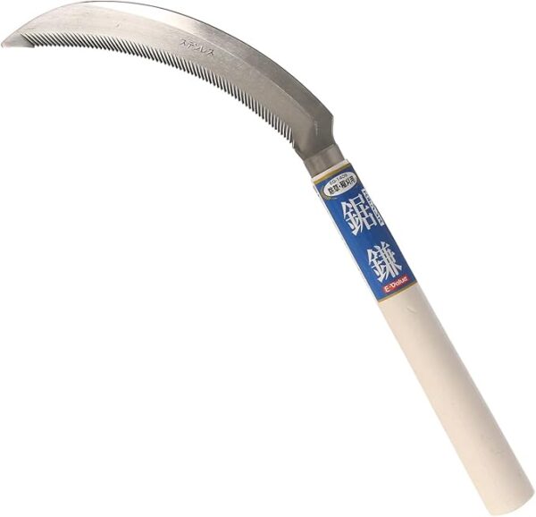 根っこから取り除くのが理想ですが、どうしても抜けない雑草は、この鋸タイプのカマで地面ギリギリから切断します。