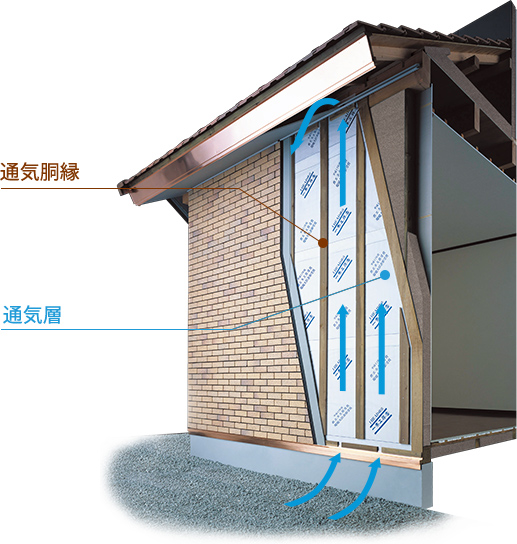 これにより、湿気がスムーズに外部へ排出され、構造体(柱や梁)が腐るのを防ぎます。