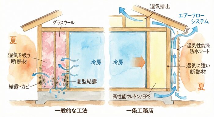 一条工務店は、「湿気を通さない断熱材」と「湿気を逃がすエアーフローシステム」のダブルの対策で、新築時の高性能を何十年も守り続ける設計になっています。