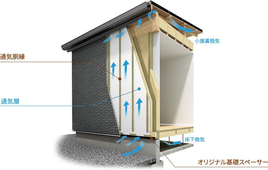 これにより、湿気がスムーズに外部へ排出され、構造体(柱や梁)が腐るのを防ぎます。