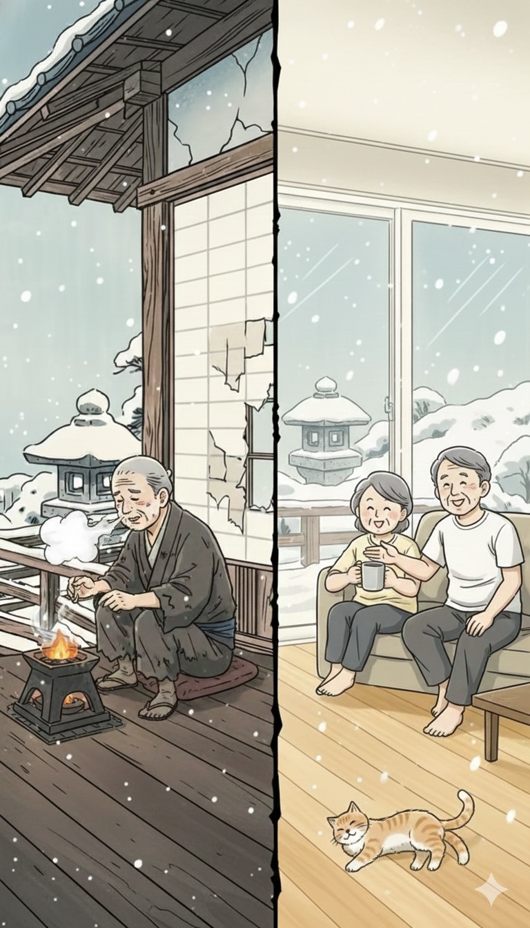 「江戸時代の冬」を描いたもので、ちょっと極端ではありますが、正直なところ、昭和の古い日本家屋で育った私たち世代には、どこか懐かしくも、あの「骨身に沁みる寒さ」を思い出させる光景ではないでしょうか。
