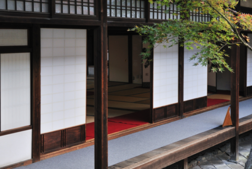 障子(紙1枚) 多くの日本家屋では、障子の外に縁側という廊下があり、さらにその外側に雨戸や軒があるという、層状の構造になっていました。これにより、雨風や寒さを防いでいました。その後、ガラスが普及し始めると、縁側の外に窓が設置され、いくぶん寒さを和らげることが出来ました。 |
