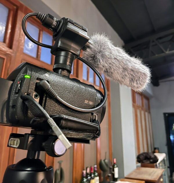 マイクは、狙った音をクリアーに録音する、鋭指向性ショットガンマイクロフォンECM-CG60です。