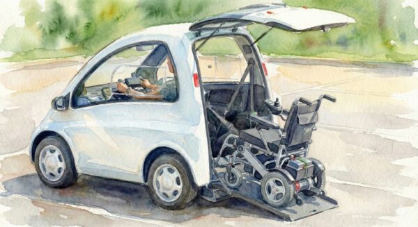足が不自由な場合は、電動車椅子に乗ったまま移動できる車両が使えます。