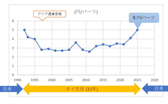 まだ30代前半だった私が、タイに赴任した頃と同じレートです。