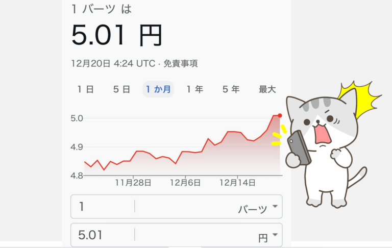 タイバーツと日本円との関係が、ついに5円/バーツになりました。