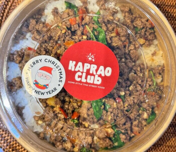 ↓こちらは、いつものガパオ専門店で買ったガパオライスですが、ちゃんとサンタのシールが貼ってありました!