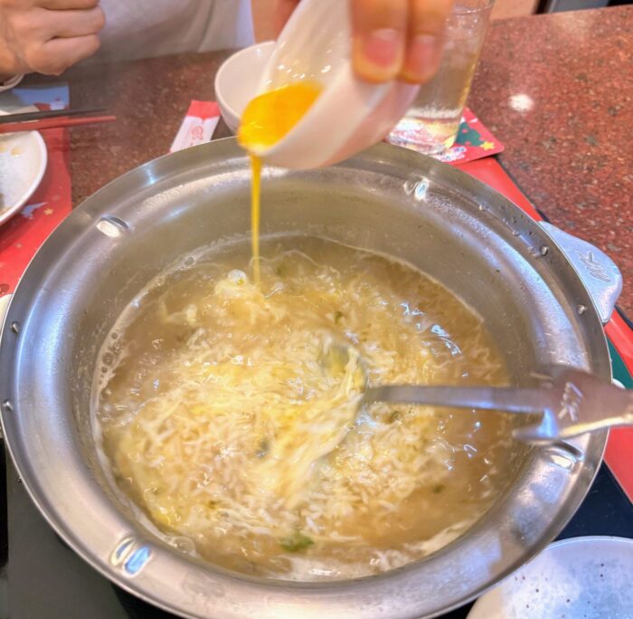 そして、ある程度ダシが出たところで、最後のしめは、我が家特性の”卵おじや”です。