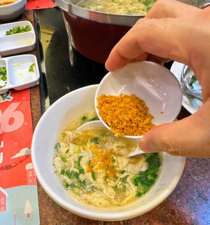 ごま油と、香ばしい揚げニンニクはとても相性が良くて、おじやが一層美味しくなります。