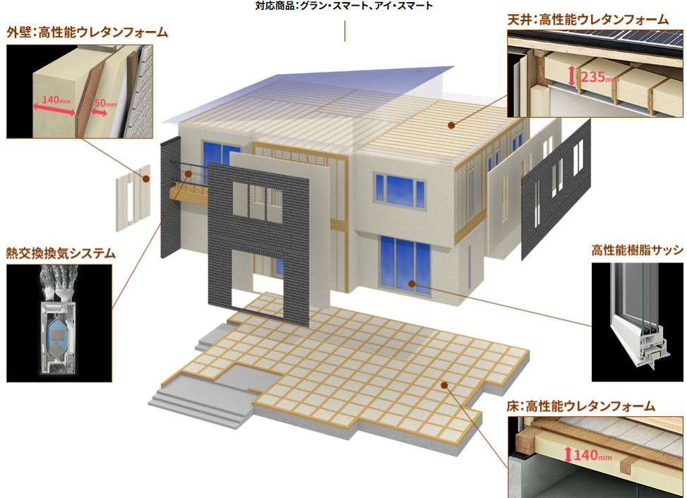 例えばコンクリートと比較すると、木材は約13倍も熱を伝えにくい性質を持っています。鉄骨住宅のように構造体が「鉄」である場合と比べると、木造であること自体が家全体の断熱性に大きく寄与しています。 - 一条工務店の対策