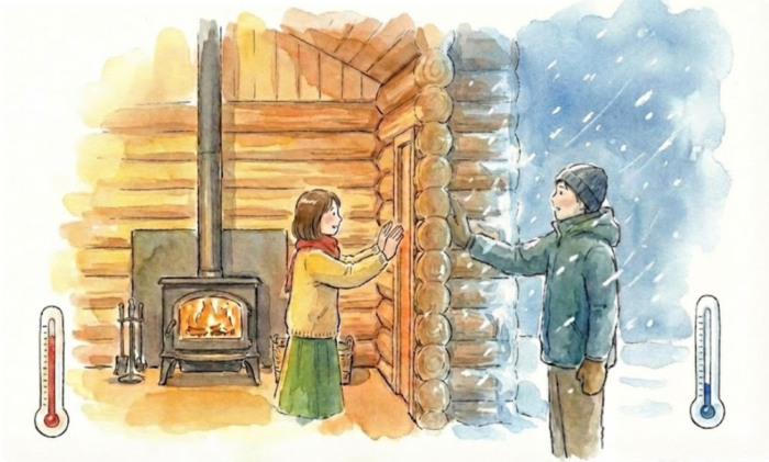 木の断熱能力を分かり易く証明してくれるのが、床、壁、天井の全てが木だけで構成されるログハウスでしょうか。