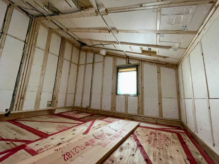 こちらの写真は、勾配天井まわりの、壁と天井の、柱と梁の断熱材です。