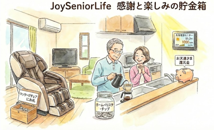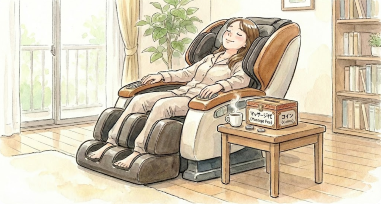 マッサージチェアと同様に「美味しい一杯をありがとう」という気持ちを込めます。外でカフェに行けば500円〜1,000円かかるところ、100円で最高級の寛ぎが得られるという「お得感の可視化」になりますね。