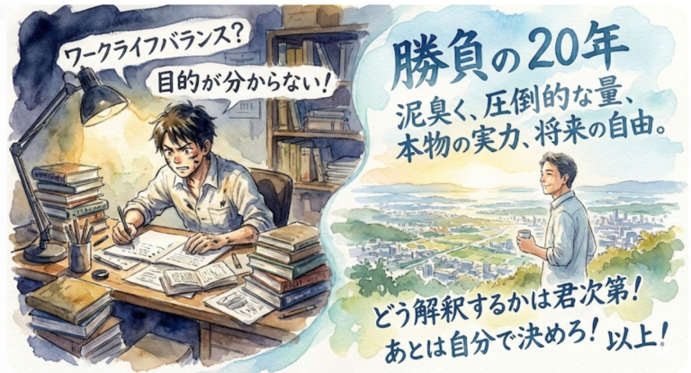 私は、20代・30代こそが、人生の土台を築くための『勝負の20年』と確信しています。ですから、もし自分が20代・30代の自分に出会ったら、『若いうちは、ワークライフバランスという言葉に甘えず、必死になって働け!泥臭く量をこなし「本物の実力」や「将来の自由」を追求しろ!』と言うと思います。