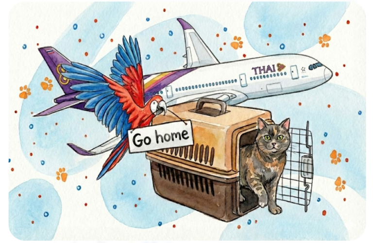 - 事前予約: タイ航空の予約センターへ、事前に「AVIH(ペットの受託手荷物)」の予約を入れる必要があります。機体(ボーイング787など)によっては、バルクカーゴの温度管理の関係で頭数制限があるため、早めの連絡をおすすめします。