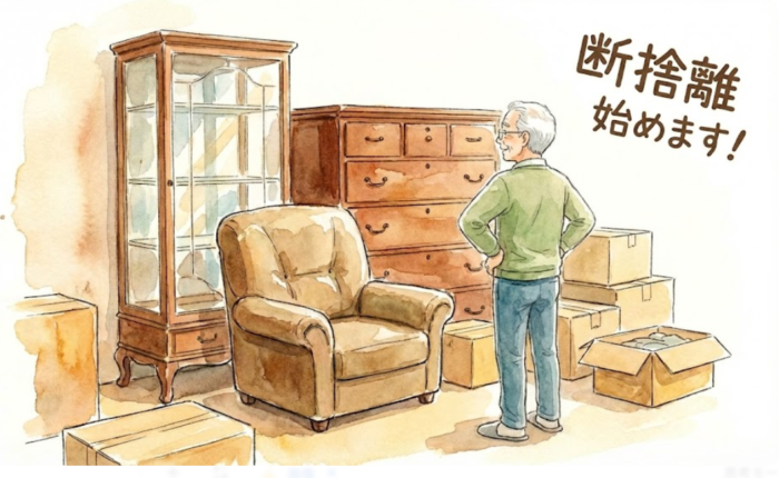 まずは、部屋の中で特にスペースを取っている大きな家具たちと向き合うところからスタートです。 飾り棚、椅子、タンス……。どれも思い出深い品々ですが、心を鬼にして選別していきます。