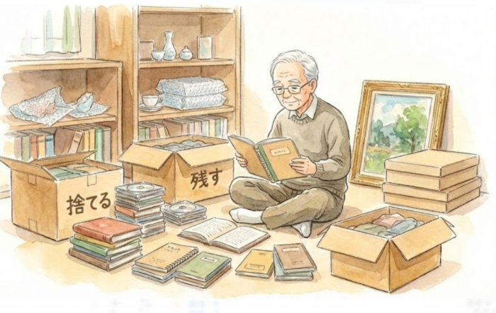 続いて、本、CD、ノート、そして棚の上の小物たち。 手に取ると懐かしい思い出が蘇り、作業の手が止まってしまうことも。 「捨てる」「残す」の箱を前に、吟味を重ねます。