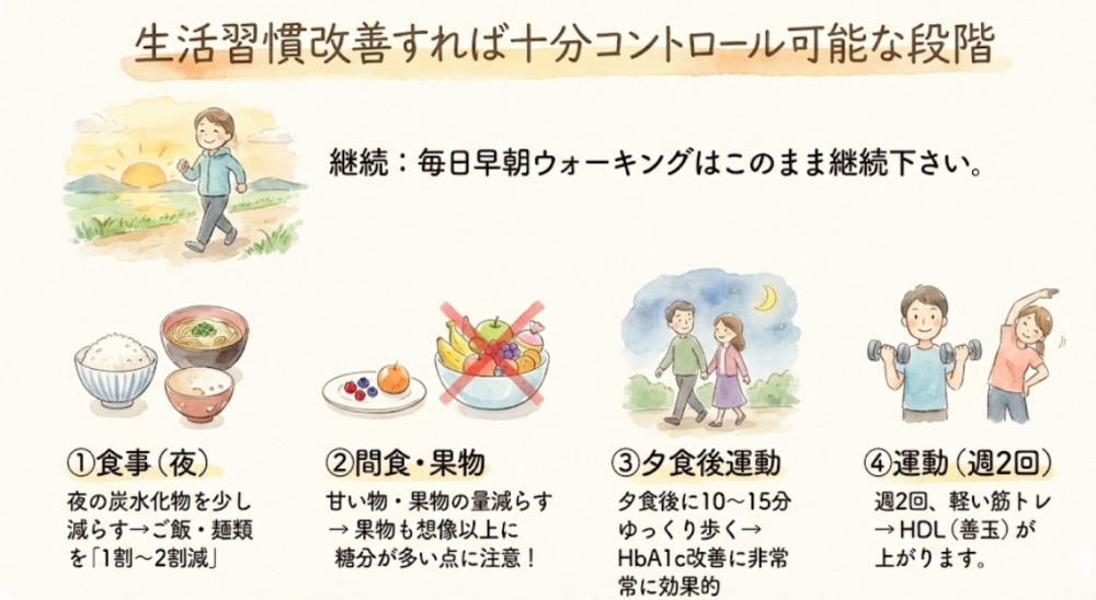 毎日の早朝ウォーキングはこのまま継続下さい。