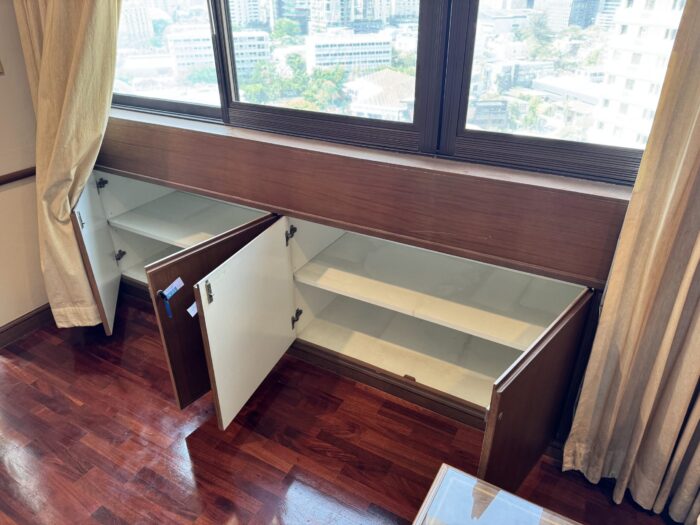 通常なら部屋の壁である場所が、何と屋外に50cmほど飛び出たキャビネットになっています。しかもそれが4部屋全てに惜しみなく設置されていますので、何百冊もの本が収納できます。勿論、物置にも使えます。