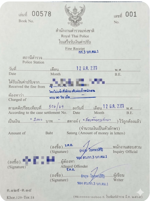 - 文書の種類: タイ王立警察が発行した公式な罰金領収書(ใบเสร็จรับเงินค่าปรับ)。