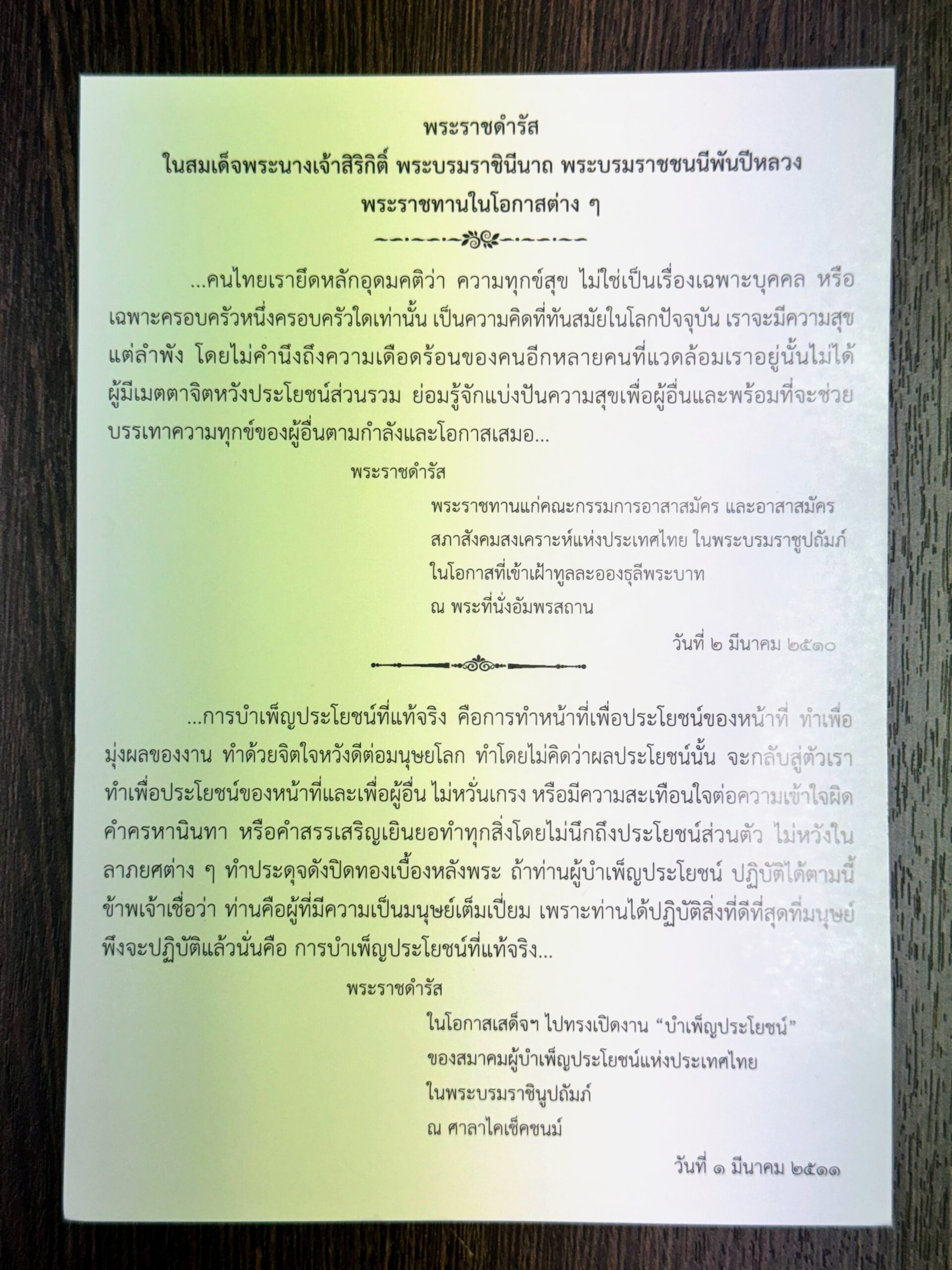 「…私たちタイ人は、幸福や苦しみは、個人や特定の家族だけのものではないという理想を堅持しています。これは現代社会において通用する考え方です。私たちは、周囲にいる多くの人々の困窮を顧みず、自分一人だけで幸せでいることはできません。公共の利益を願う慈悲の心を持つ人は、他者のために幸福を分かち合うことを知っており、常に自らの力と機会に応じて、他者の苦しみを和らげる助けをする準備ができているものです…」