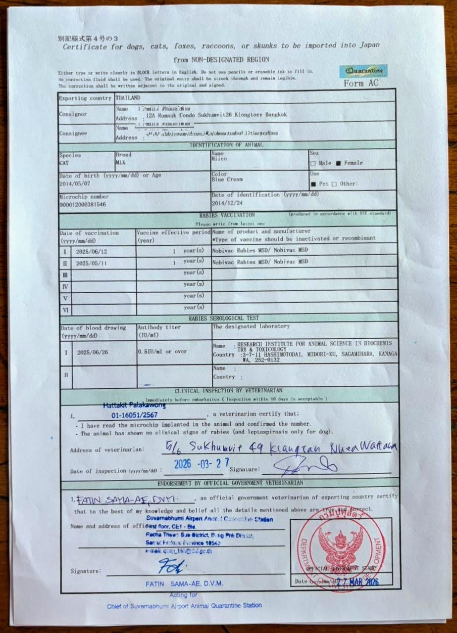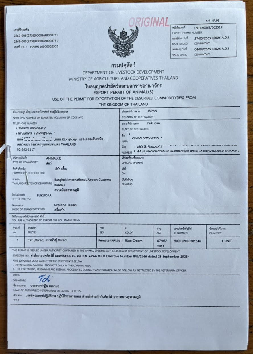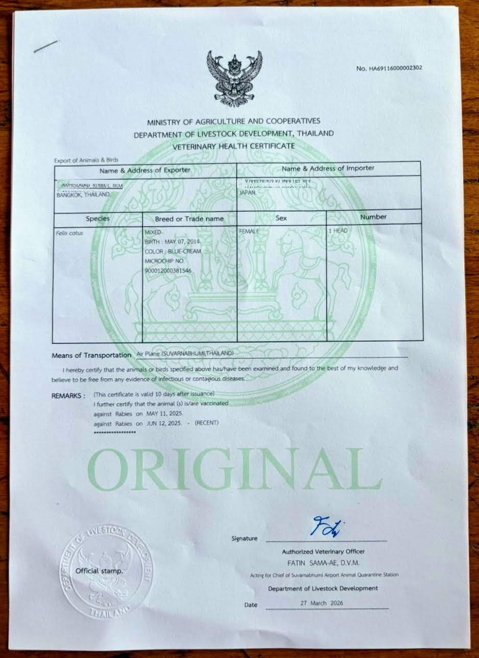 ③この書類は、日本への入国時に動物検疫所に提出する非常に重要な証明書です。タイ側の輸出許可証とも内容が一致しています。