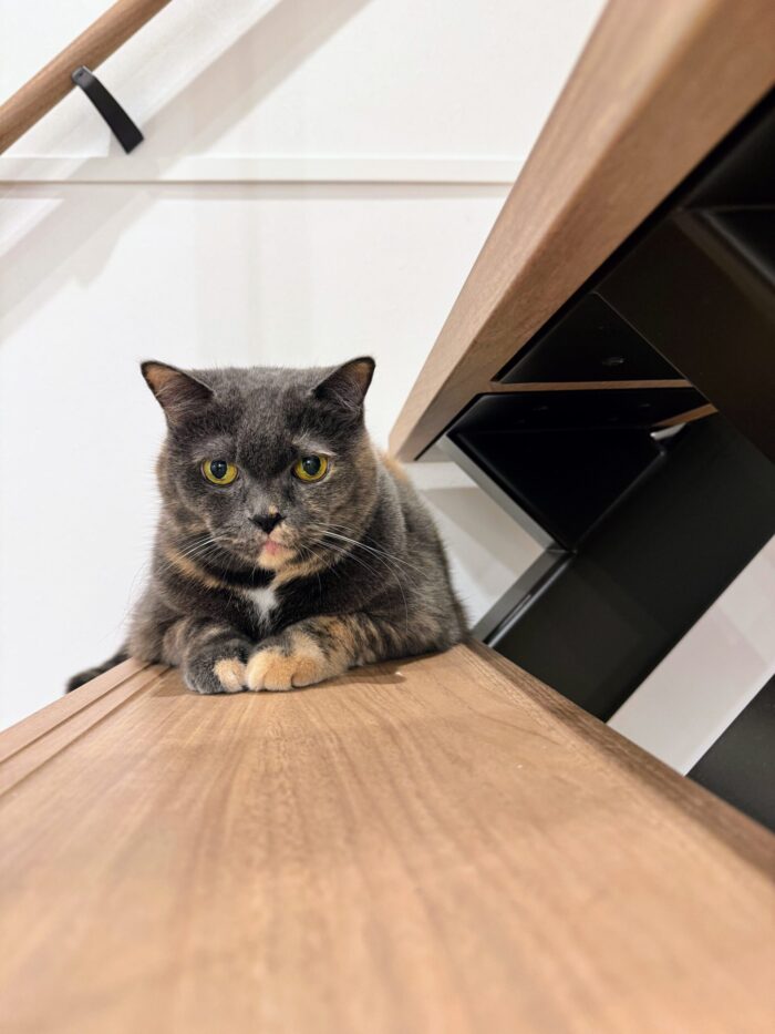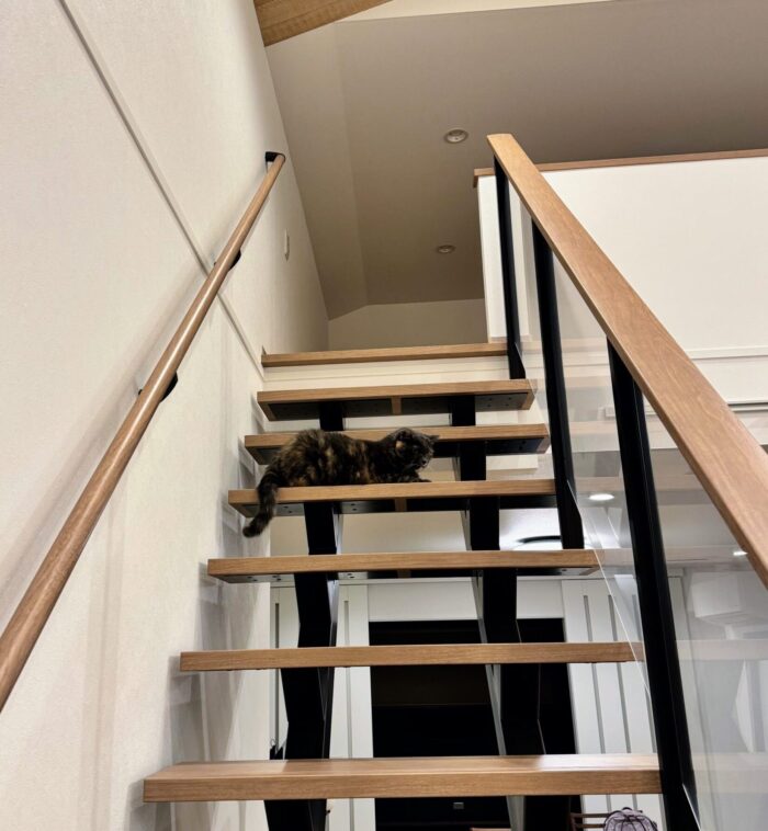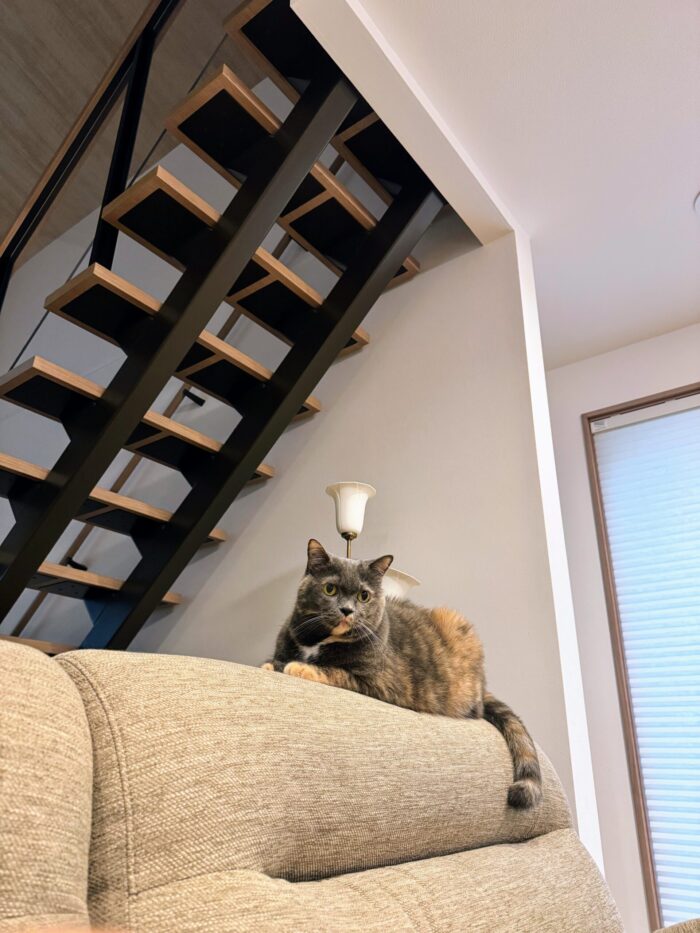 ロフトからみーこを呼んでみたら、恐る恐るですが、自分で階段を登って来ました。高いところから家の様子を見渡せて、猫地図も一気に精度があがったようです(笑)