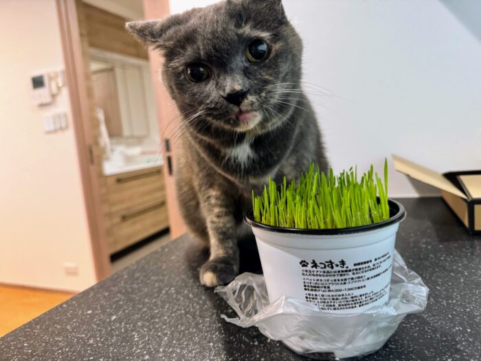 今日は、カップボードの上にあった、まだ栽培中の猫草を見つけて、むしゃむしゃ食べていました(笑)