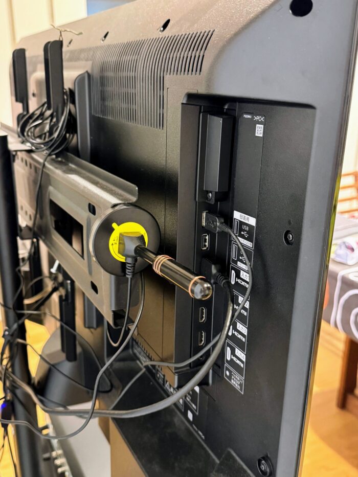 普通は、壁とテレビを同軸ケーブルでつなぎますが、我が家のテレビは移動式のフリーアドレス式ですので、室内アンテナを使っています。