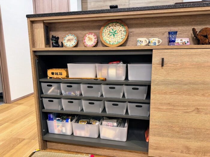グレイスキッチン前面の飾り棚は、容積はあまり大きくないのですが、小物を細かく分けて収納することが出来て、なかなか使い勝手がいいです。