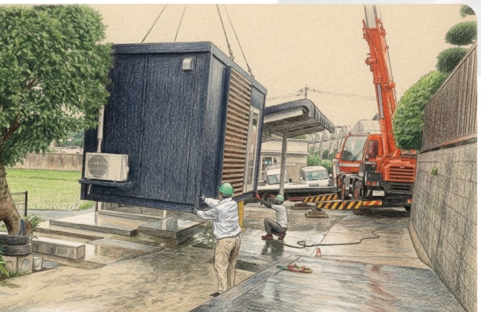 簡易基礎を設置後、すぐにユニットハウスを据え付けます。恐らく2時間以内の作業だと思います。